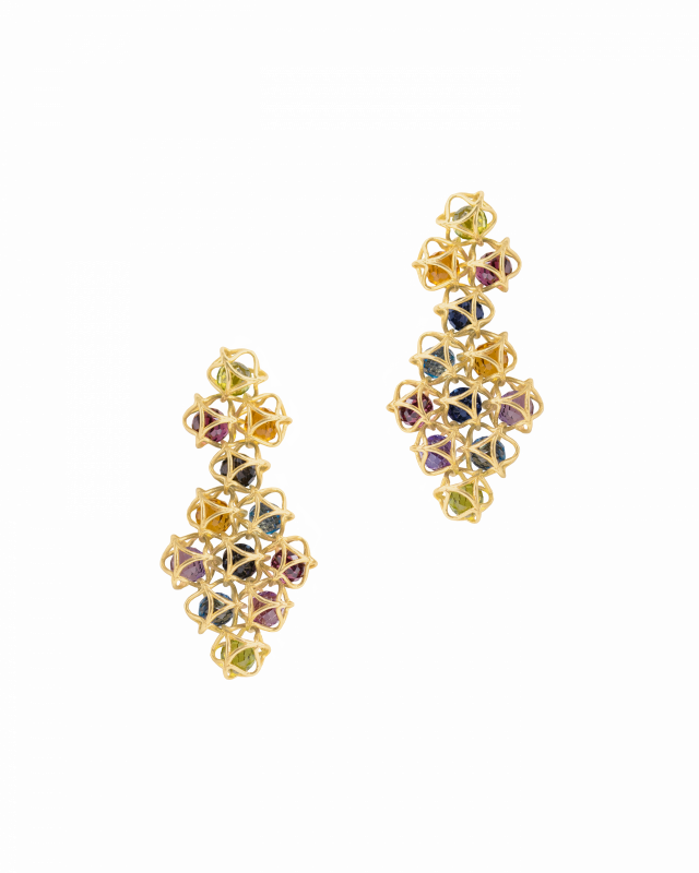 18 krt geelgouden "Embrace" oorbellen met diverse edelstenen.
