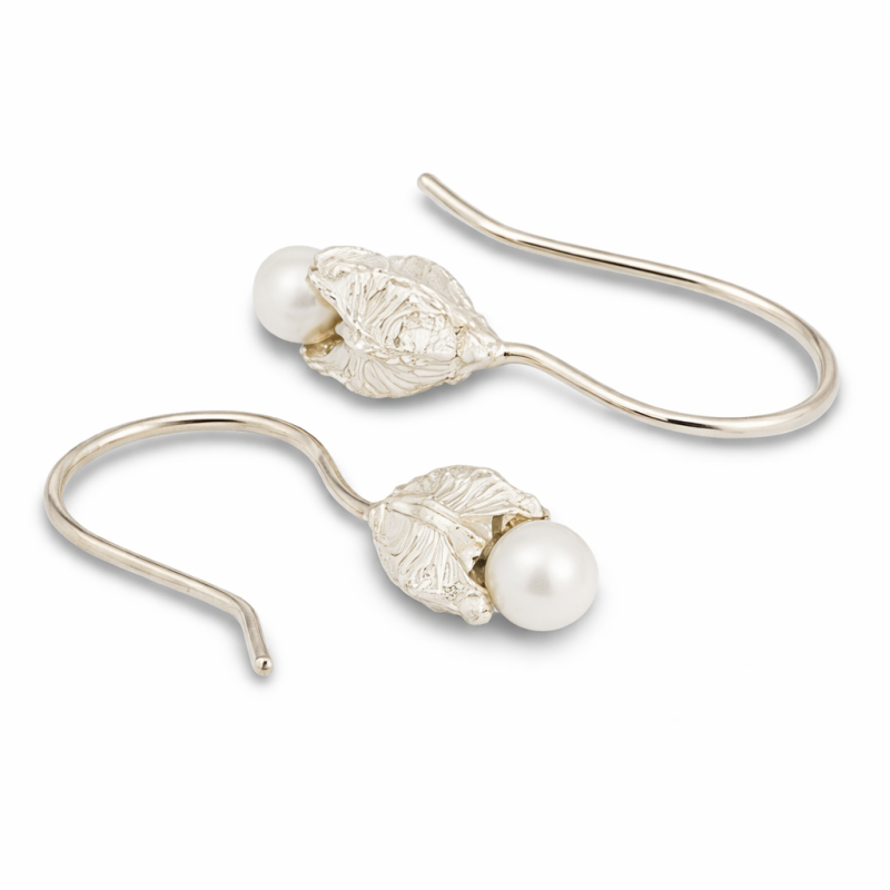 Zilveren koningskaars oorhaakjes met witte zoetwater parels.