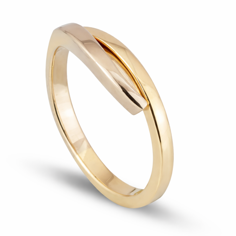Geel- witgouden smeedring bestaande uit twee opstaande delen langs elkaar gebogen.