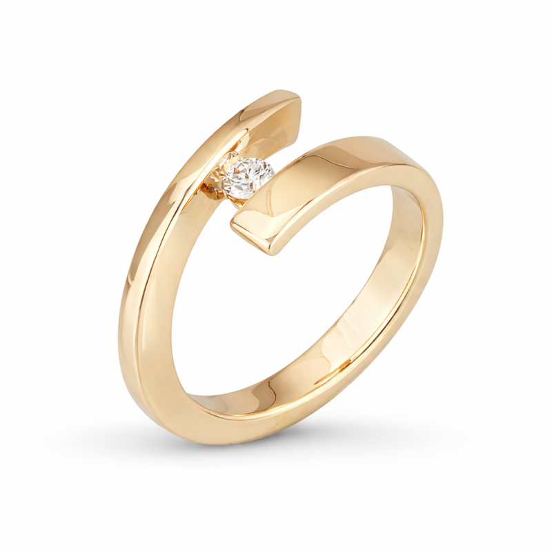 Geelgouden smeedring vlak en staand met diamant in klemzetting.