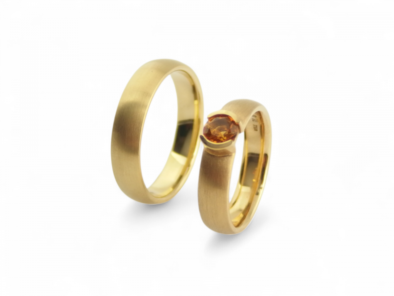 Geelgouden trouwringen met in de damesring een Madeira citrien.
